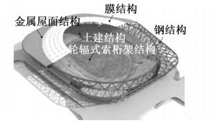 體育場平面為不規(guī)則五邊形,下部為4層混凝土結(jié)構(gòu)看臺,上部為鋼結(jié)構(gòu)罩棚。罩棚以V形柱及受壓環(huán)梁為界,分為外圈鋼結(jié)構(gòu)和內(nèi)圈鋼結(jié)構(gòu)。