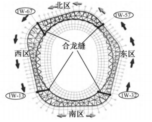 根據(jù)施工分區(qū)設(shè)置4條合龍縫,如圖2所示,單條合龍縫由內(nèi)向外合龍。合龍縫部分桿件吊裝至高空后,通過臨時卡板及安裝螺栓固定,待合適的合龍時間再進(jìn)行桿件對接焊接。